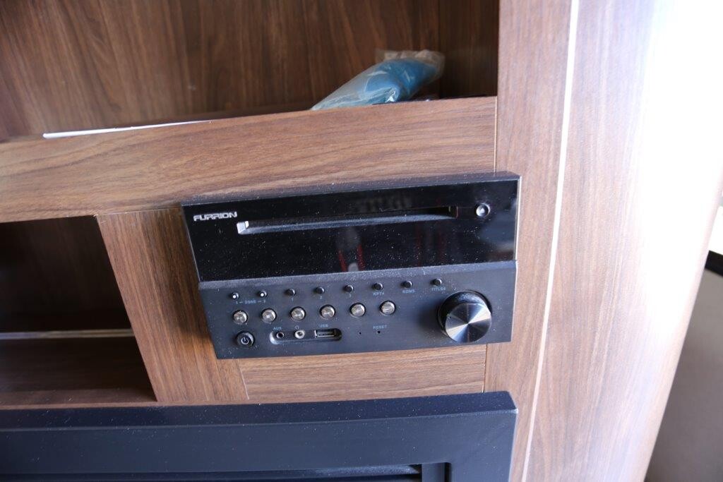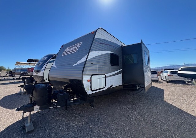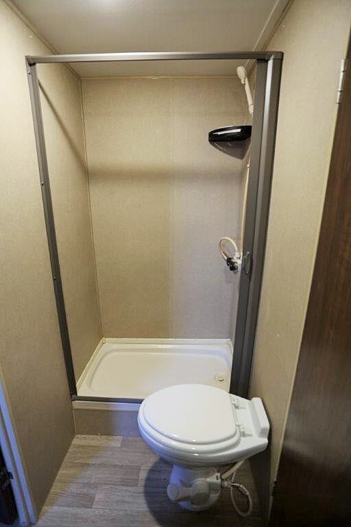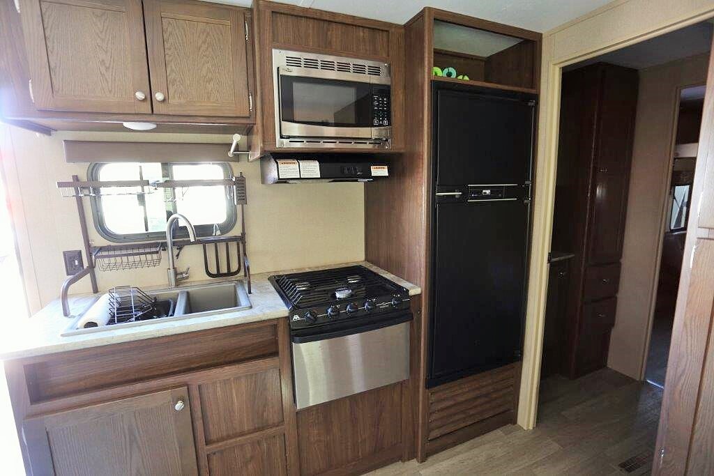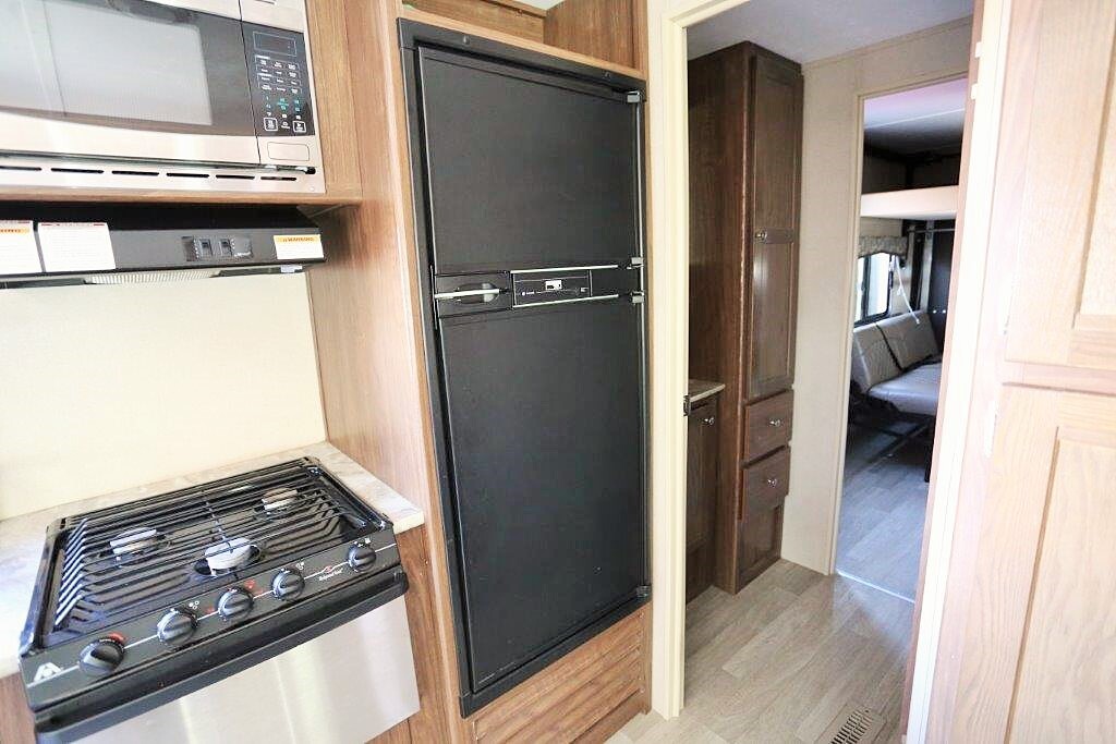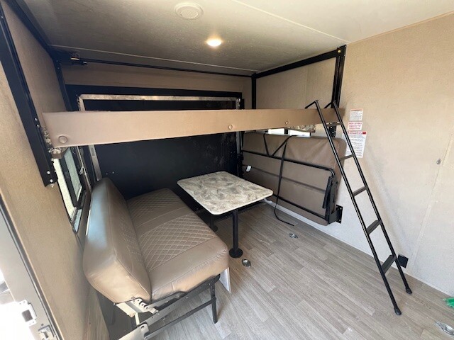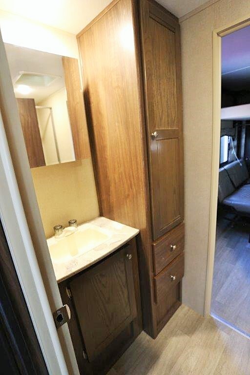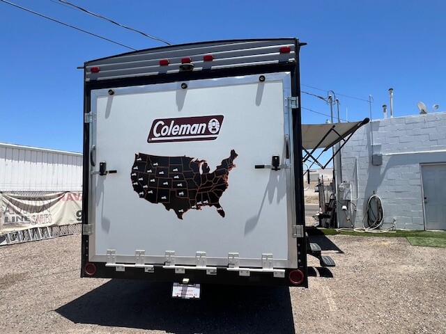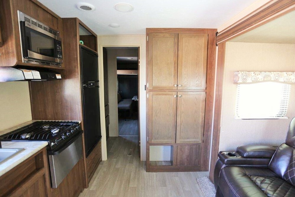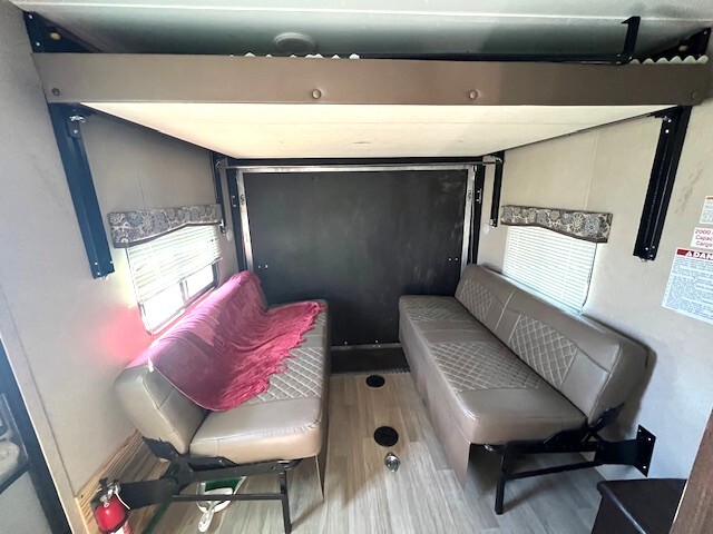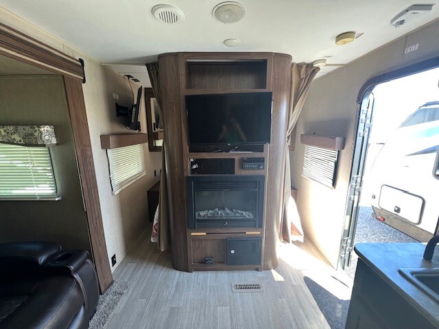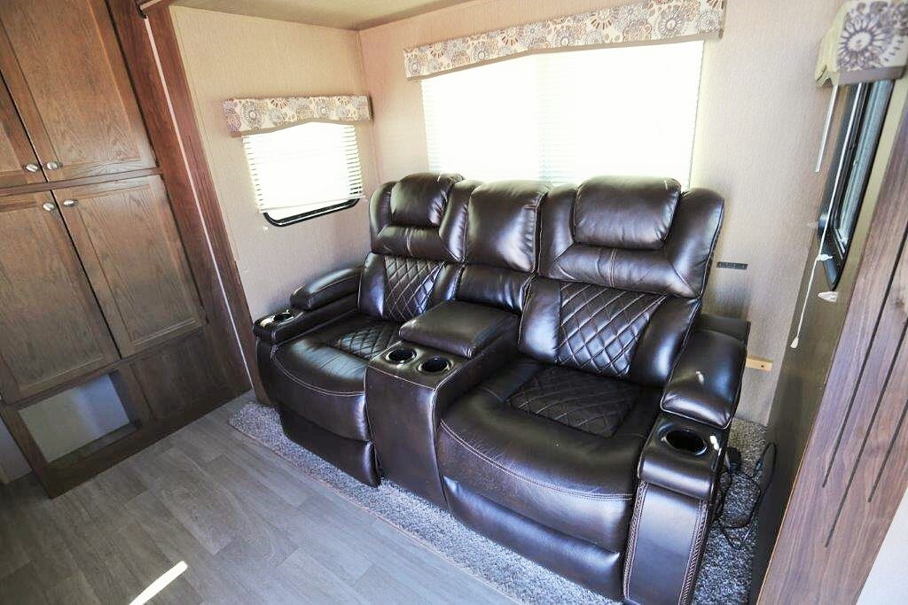 10 ft garage, Two separate bedrooms with 2 entry doors, the back bedroom sleeps 4, front bedroom sleeps 2. Has 2 AC's, middle bathroom with shower, Has 3 new TV's, digital antenna, Theater recliners, 30 amp RV, storage cabinets, enclosed bathroom and shower, separate vanity, stainless appliances, Oven, gas grill cook top, microwave, oven, fridge, Fireplace, DVD and CD Player, Electric theatre chairs, queen bed with linen closets. Trailer is clean and no smokers.
