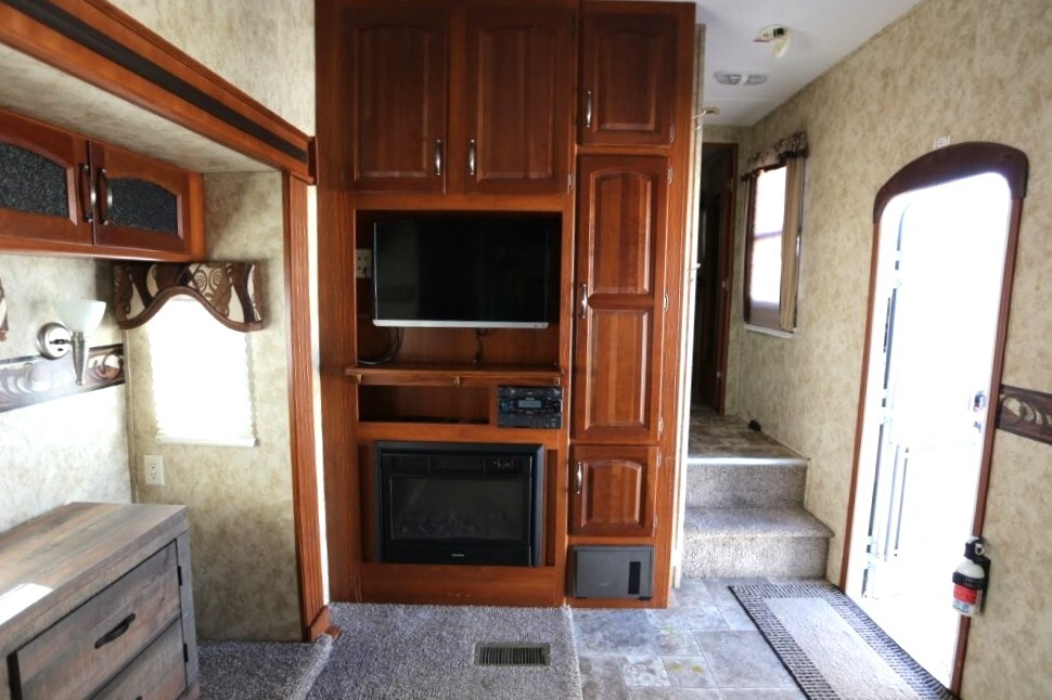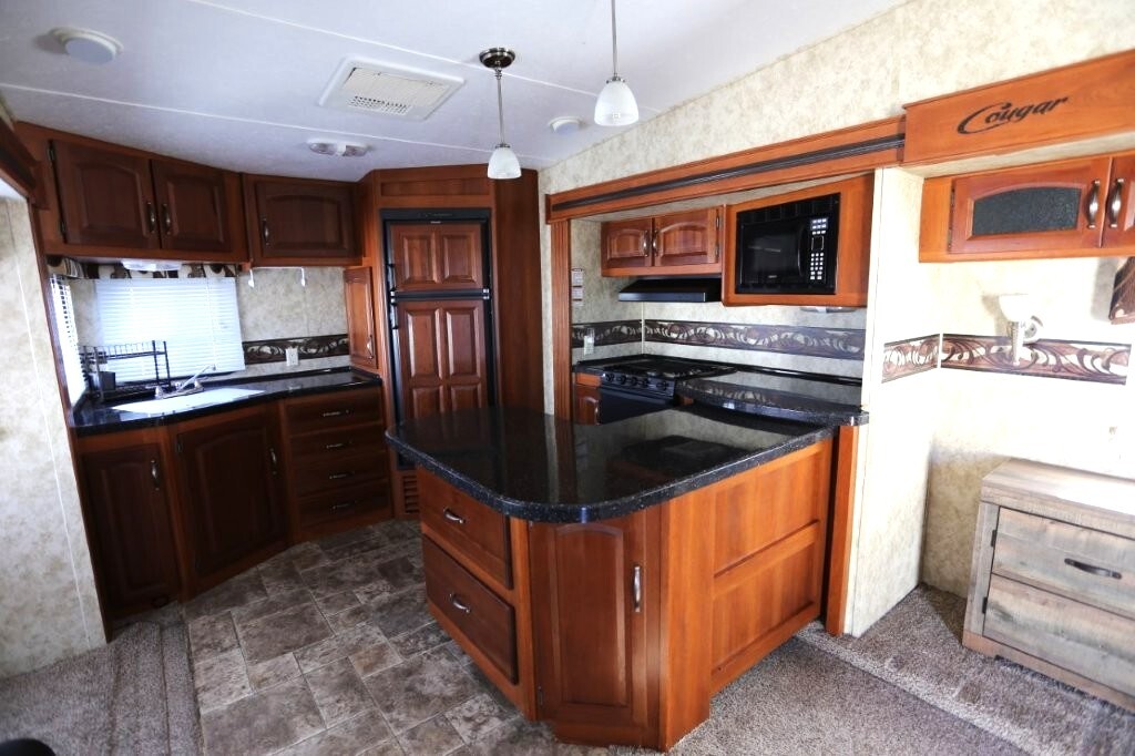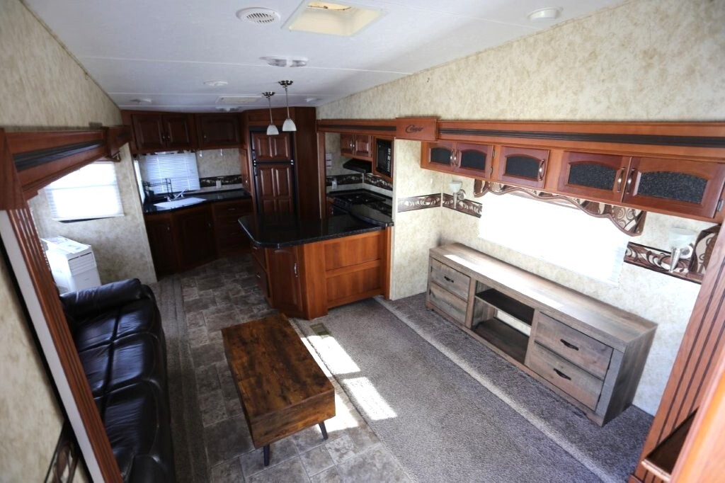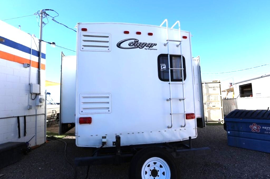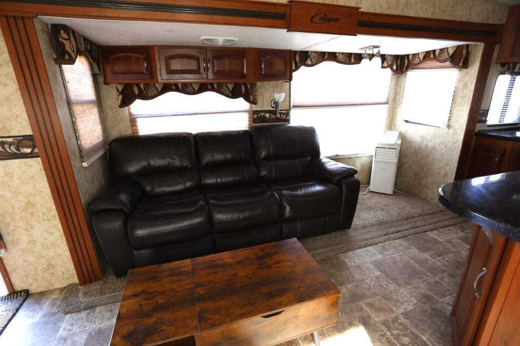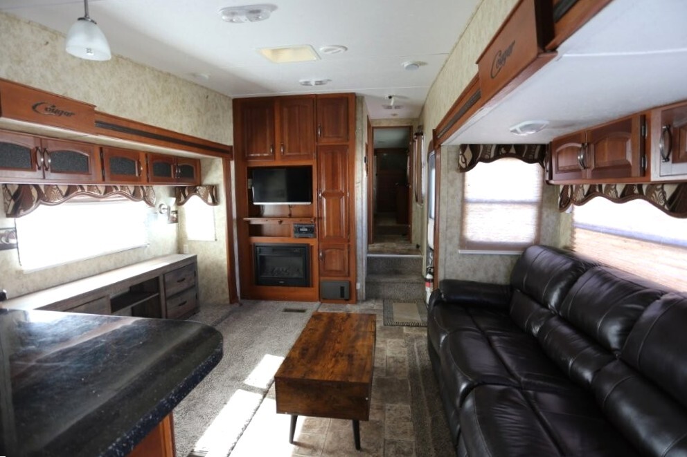 3 slides, snap on skirting all custom and made for this RV, basement storage, all weather insulation package, Polar package, spare tire and rack, new battery, good tires, dry weight 9,990, cargo capacity 2,040, Rear kitchen with spacious counters, solid surface counters, gas grill cooktop, oven, microwave, fridge, j shaped counter with bar, sofa with TV and fireplace, stereo system, Option to buy as is $19,995 or Add these items: Dinning Table and chairs (add $250), 2 Recliners (add $1098) comes with sofa and coffee table, amour can be removed or add a larger TV, endless possibilities to make this Cougar how you want it. We have matching recliners as well in stock to add. Awning fabric will be $500, all enclosed bathroom with low step shower, queen bed, Large master closet, Linen drawers, 50 Amp service, night shades, Some of the decals are faded and some are cracking. Remote for convenience. Priced to sell!
