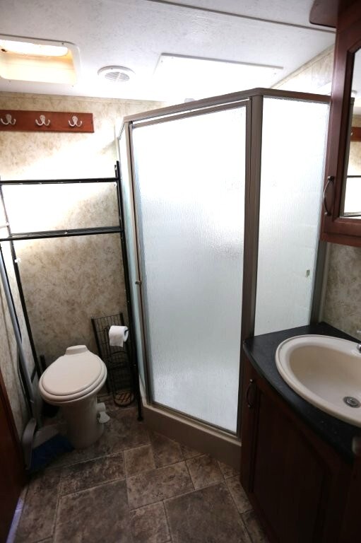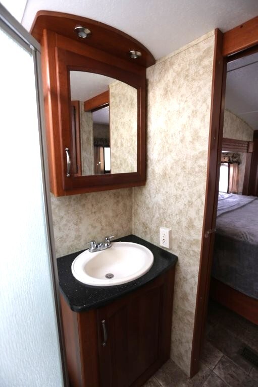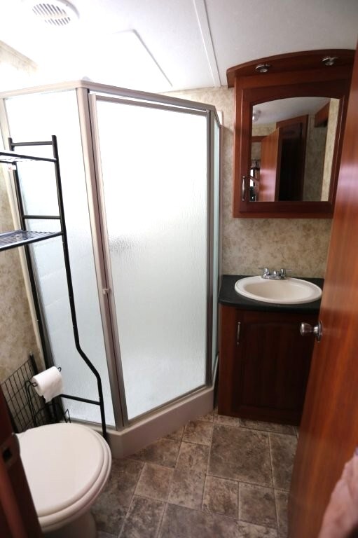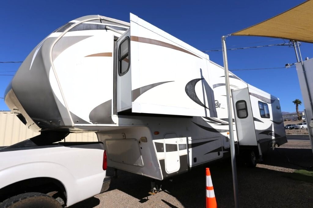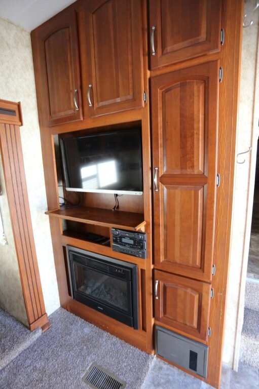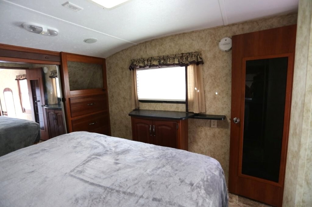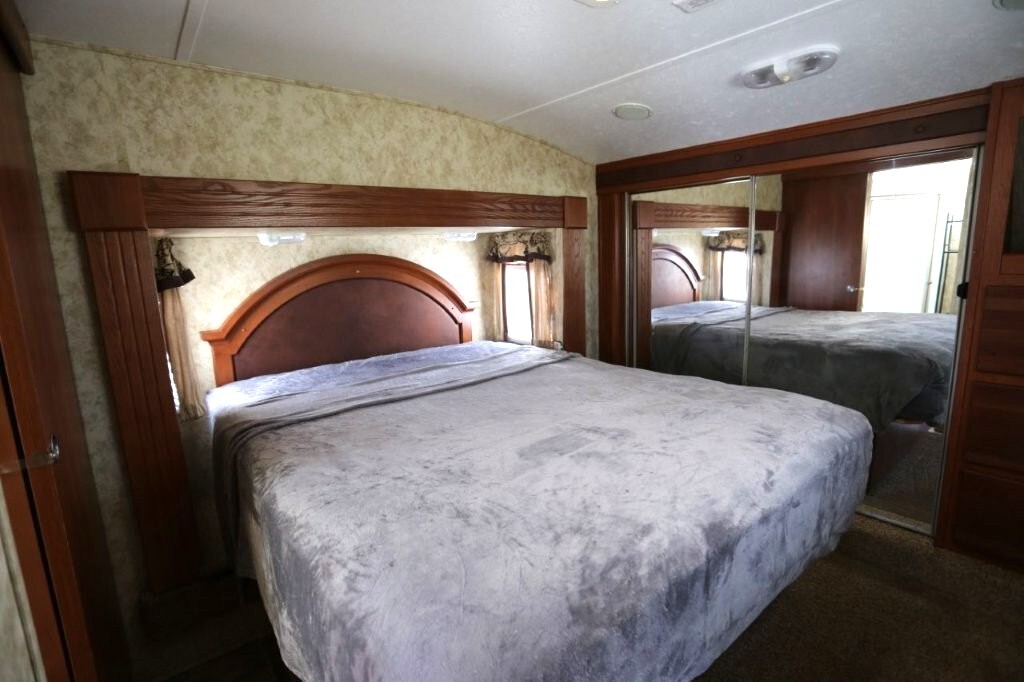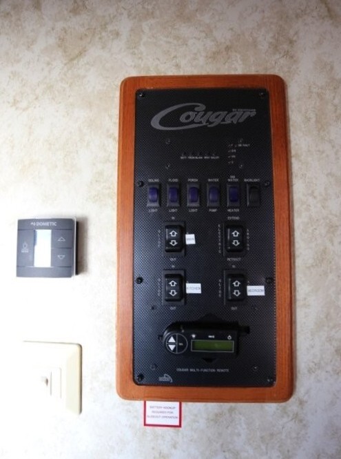 3 slides, snap on skirting all custom and made for this RV, basement storage, all weather insulation package, Polar package, spare tire and rack, new battery, good tires, dry weight 9,990, cargo capacity 2,040, Rear kitchen with spacious counters, solid surface counters, gas grill cooktop, oven, microwave, fridge, j shaped counter with bar, sofa with TV and fireplace, stereo system, Option to buy as is $19,995 or Add these items: Dinning Table and chairs (add $250), 2 Recliners (add $1098) comes with sofa and coffee table, amour can be removed or add a larger TV, endless possibilities to make this Cougar how you want it. We have matching recliners as well in stock to add. Awning fabric will be $500, all enclosed bathroom with low step shower, queen bed, Large master closet, Linen drawers, 50 Amp service, night shades, Some of the decals are faded and some are cracking. Remote for convenience. Priced to sell!