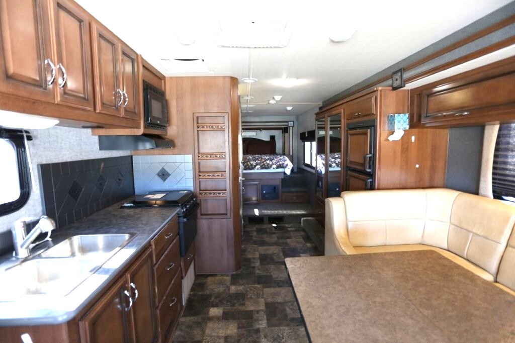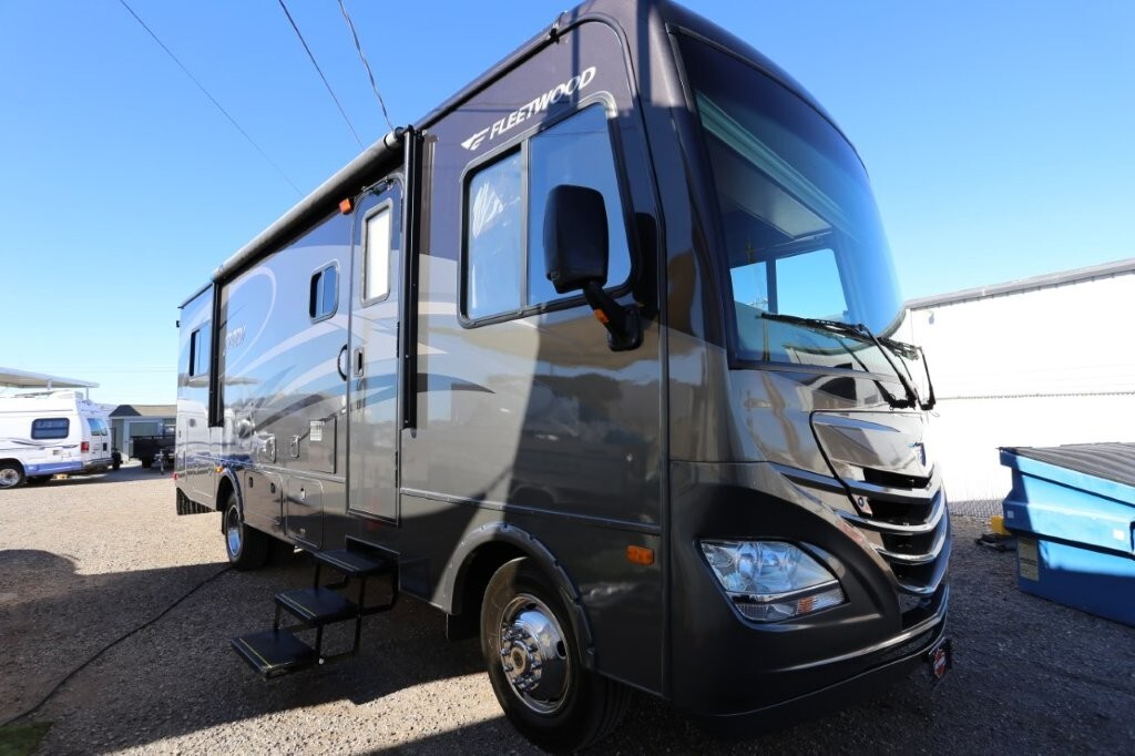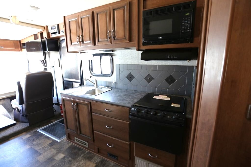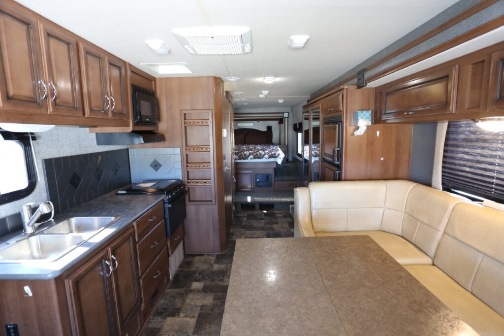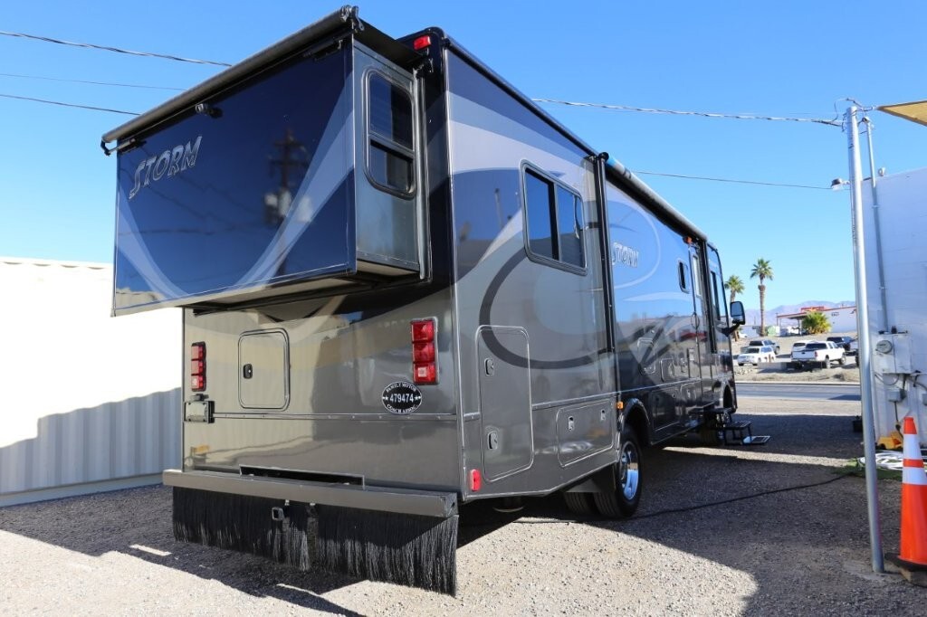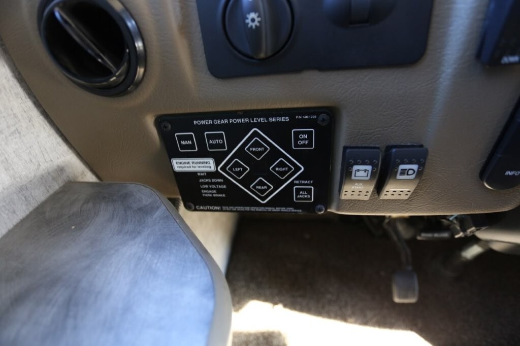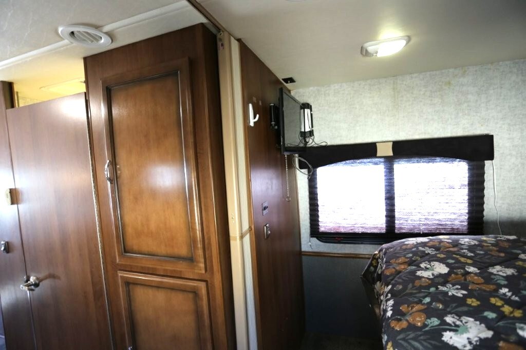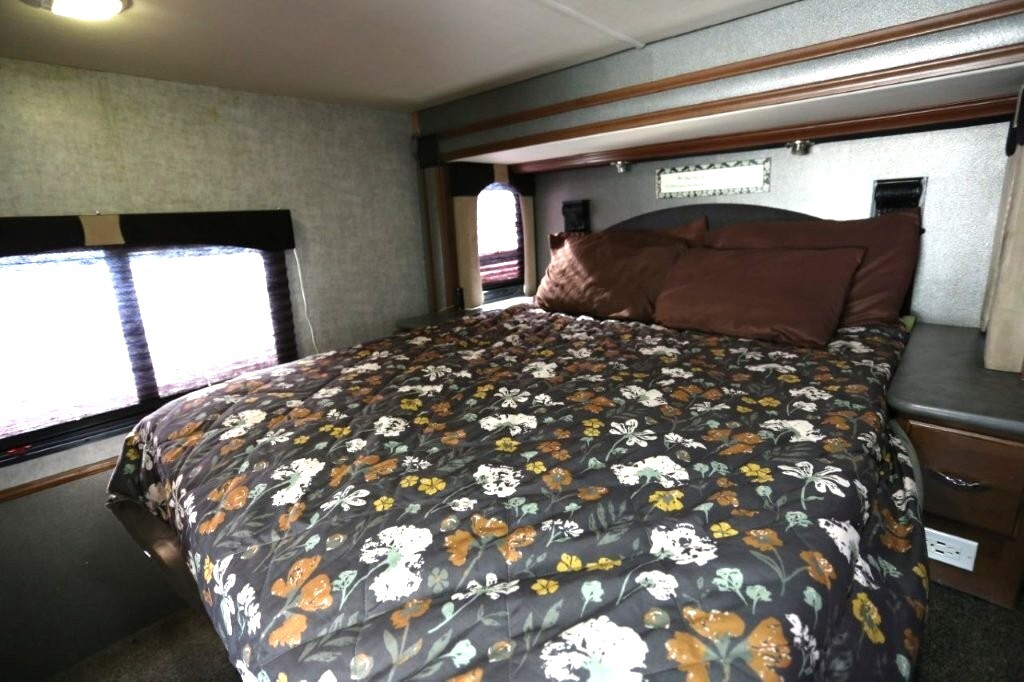 Ford V10, 27k, sleeps 5, two slides, onan micro quite 4000 generator, 28.8 feet long, full body paint in excellent shape, power awning, side cameras, back up camera, basement store with easy clean compartments, awning slide toppers, back up camera, hitch receiver, newer tires, newer batteries, drop down bed over cab, Tv on swivel, Winegard satellite, Bluetooth stereo, dvd and Cd player, automatic leveling system, inverter 3000 also in bedroom, microwave with hood vent, fridge, gas grill cooktop, oven, solid surface counters, dinette with movable swivel table, night shades, added surge electric strips for power in convenient places thru RV, all enclosed bathroom, low step shower, walk around queen bed, TV in master, closet, linen closets. Clean inside and out. No smokers, no rust, no damage. Couch shows some wear as seen in images on the arms.